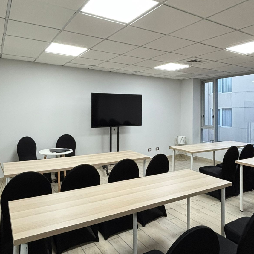 Sala53 permite múltiples configuraciones (auditorio, sala de clases, directorio), adaptándose a tus necesidades específicas: talleres, charlas, sesiones de coaching, capacitaciones o reuniones creativas. Ideal para equipos de 3 a 45 personas.